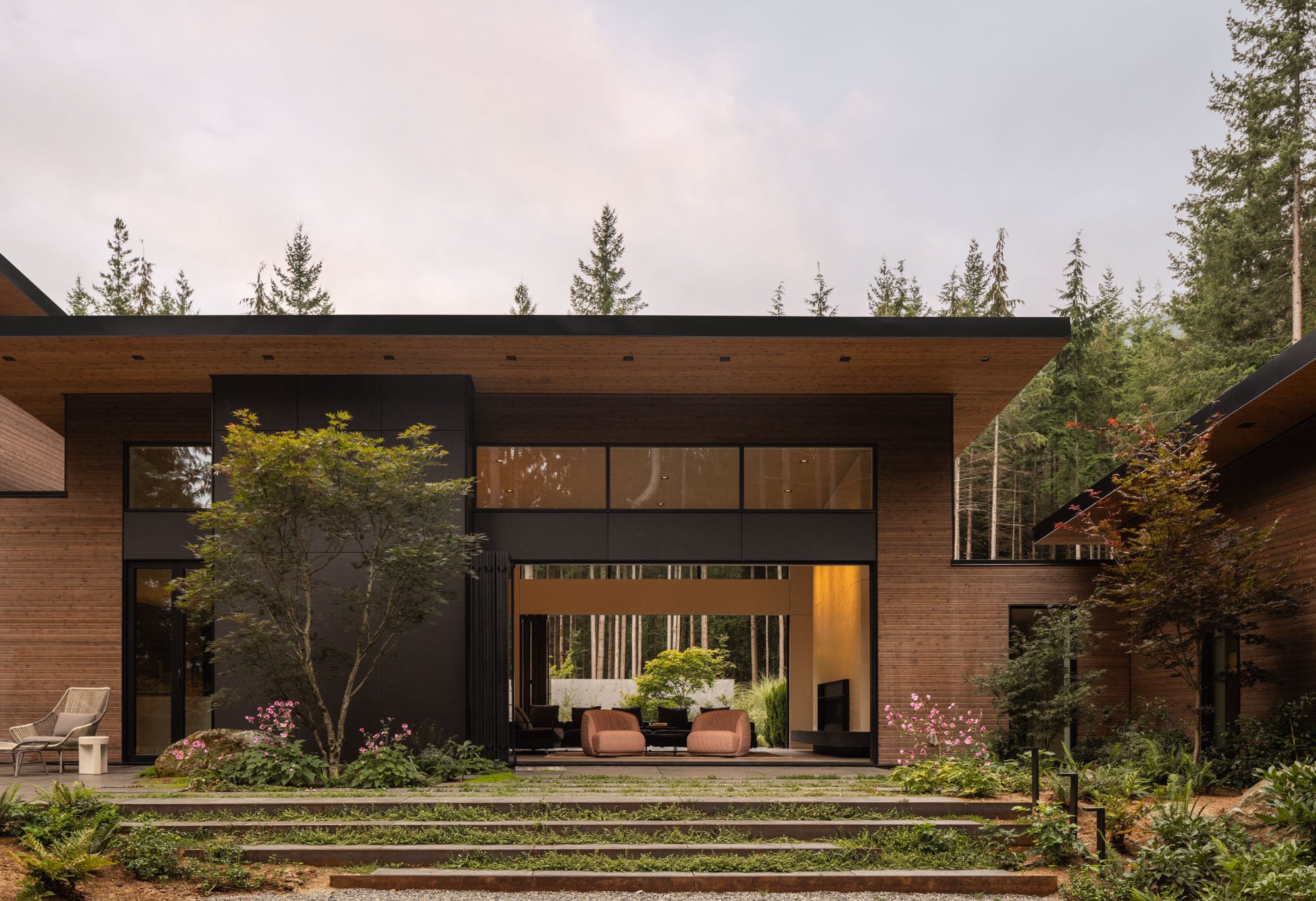 Uplands House nestles within a deliberate clearing carved from densely replanted evergreens. The clients approached Dan and his wife Sandra (also a designer) in 2017 to walk the newly acquired site, rekindling a collaboration that began years earlier with the remodel of their previous home.